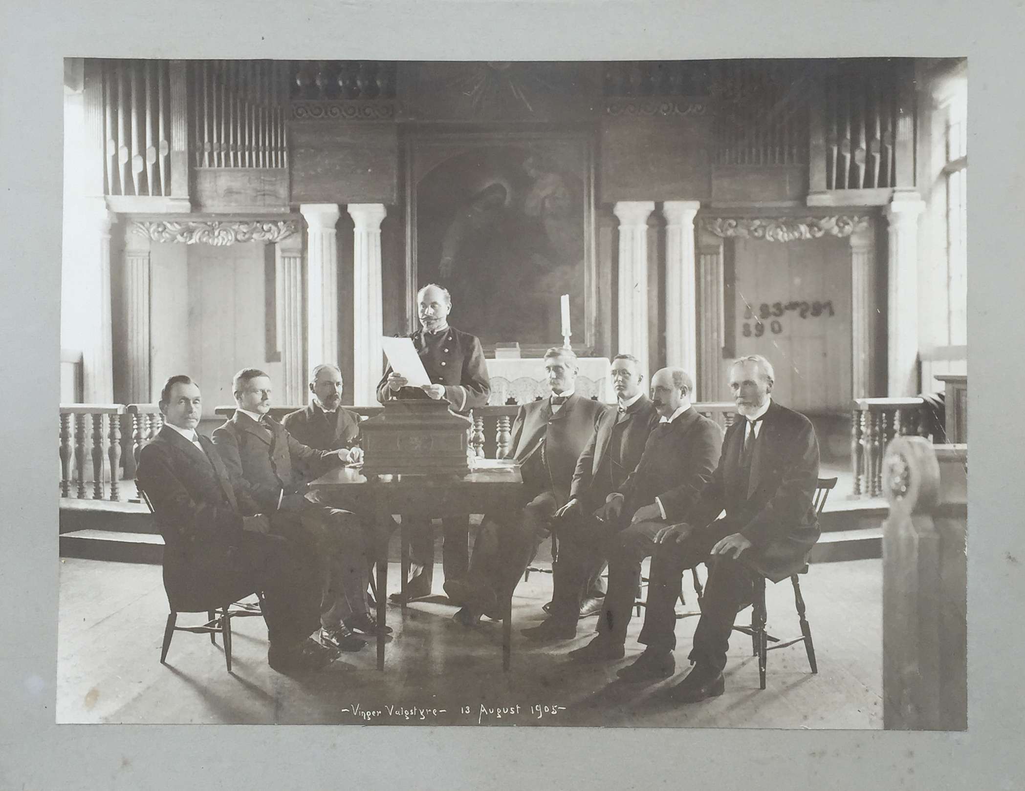 Søndag trettende august 1905. Åtte alvorlige formelt kledde eldre herrer har tatt plass rundt valgurnen i koret i Vinger kirke for fotografering. Dette er formannskapet i Vinger som utgjør valgstyre og er ansvarlige for gjennomføringen av folkeavstemmingen i kommunen.